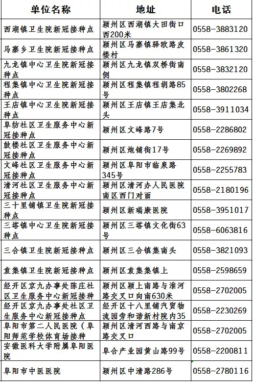潁州區新冠疫苗接種點地址
