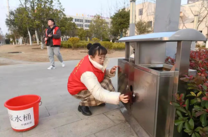 △2月24日,在阜陽市潁州區(qū)文峰街道辦事處中清社區(qū),“潁火蟲”志愿者在游園廣場為垃圾分類箱“洗臉”。