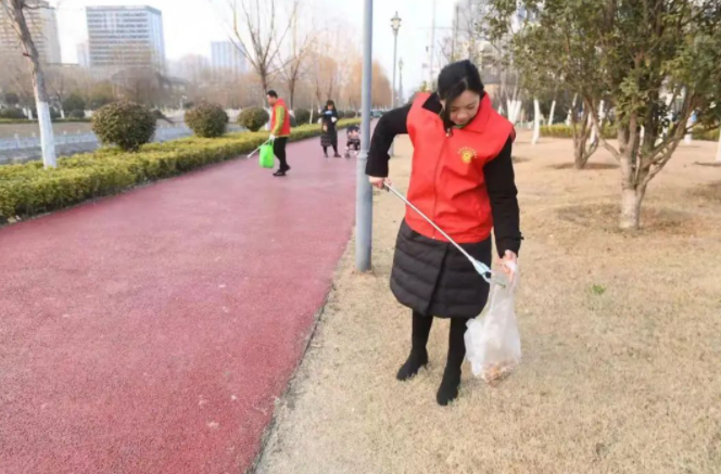 △2月24日,在阜陽市潁州區(qū)文峰街道辦事處中清社區(qū),“潁火蟲”志愿者服務(wù)隊的志愿者在游園廣場撿拾煙頭。
