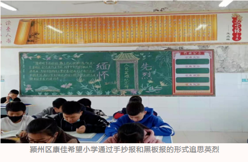 春風送暖,又逢清明。在這緬懷追思的傳統節日里,為傳承弘揚英烈事跡和精神,引領崇尚、緬懷、學習、捍衛英烈的風尚,潁州區康佳希望小學、潁州區劉锜小學的學生們紛紛通過主題班會、手抄報、黑板報等方式追思英烈,表達對英雄的崇敬之情。