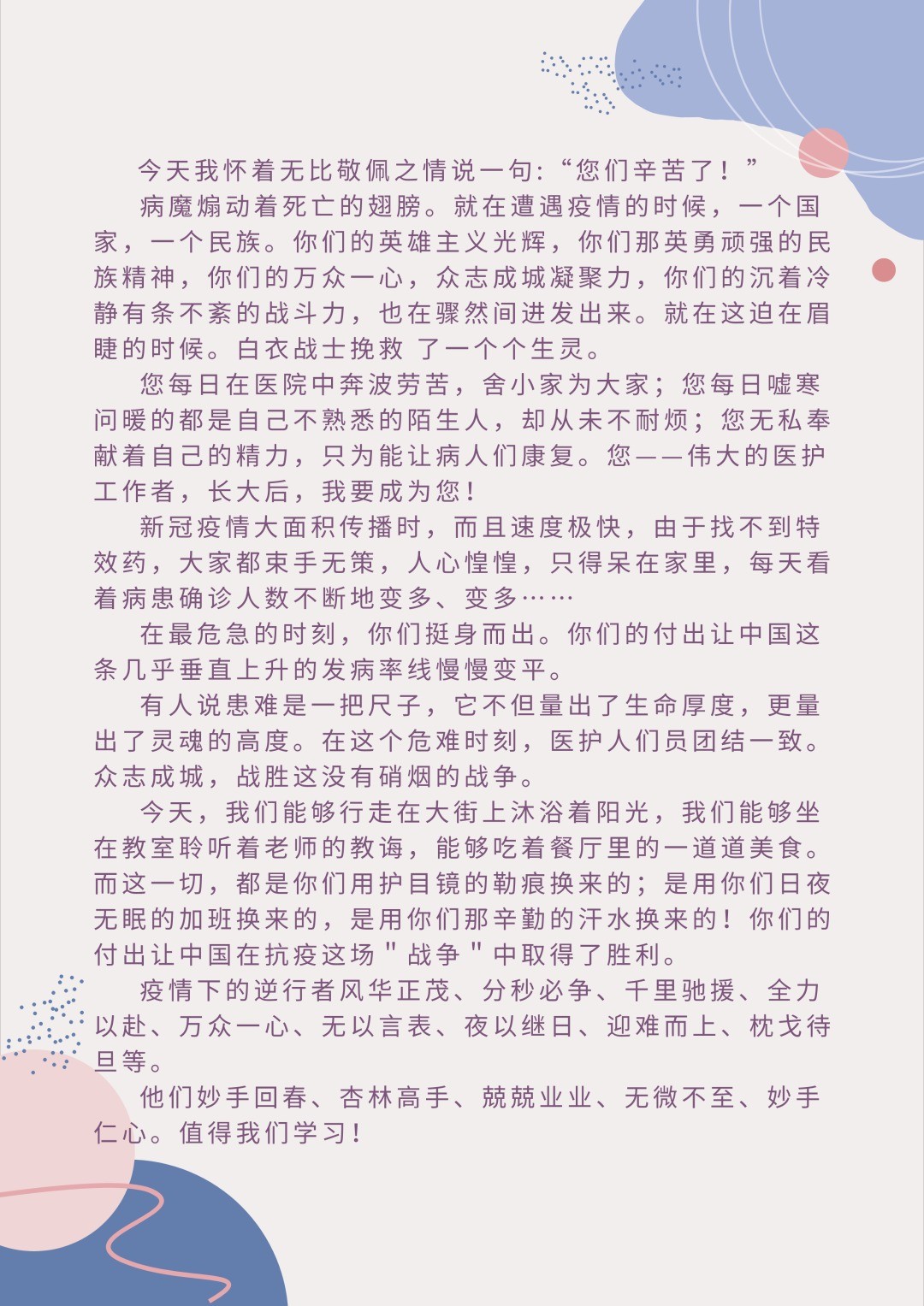 “您每日在醫院中奔波勞苦,舍小家為大家;您每日噓寒問暖的都是自己不熟悉的陌生人,卻從未不耐煩;您無私奉獻著自己的精力,只為能讓病人們康復。您——偉大的醫護工作者,長大后,我要成為您!”