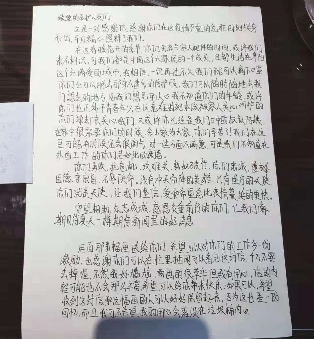 “后面那幅畫送給你們,希望可以對你們的工作多一份激勵,也感謝你們可以在忙里抽閑可以看完這封信,信的內容可能也不會那么豐富,希望可以給你帶來快樂。”