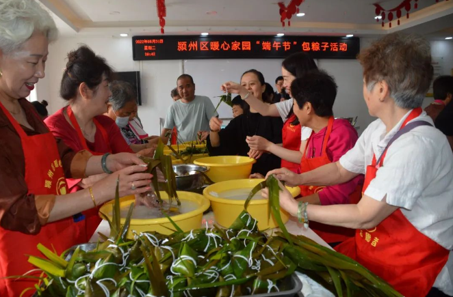 阿姨們忙著包粽子,大叔大伯們有的鋪開(kāi)象棋對(duì)壘,有的走進(jìn)健身室鍛煉,愛(ài)唱歌的大叔打開(kāi)音響,放聲歌唱,一邊展示歌喉,一邊為包粽子的阿姨鼓勁加油,暖心家園里頓時(shí)熱鬧異常,掌聲陣陣,歡歌笑語(yǔ)不絕于耳。粽子煮好后,志愿者把香噴噴的粽子端到餐桌,讓老人們一起品嘗勞動(dòng)成果,品味幸福生活。