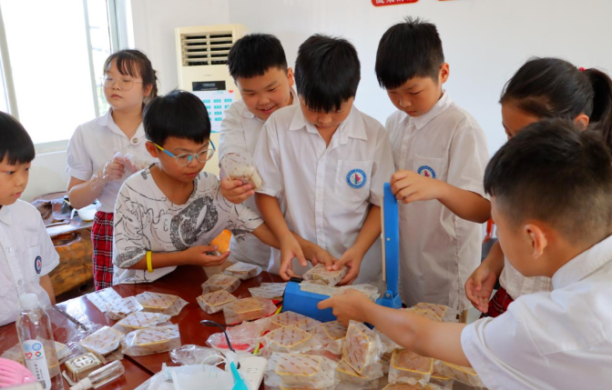 活動現場,糕點老師大致講解了一下制作月餅所需的材料、步驟以及注意事項,孩子們躍躍欲試,看著桌面上的食材、工具,個個爭先恐后有的揉面團、有的壓皮、有的包餡、有的壓模具,忙得不亦樂乎。一會兒功夫,一塊塊獨特并充滿愛意的月餅在他們動手合作中完成了,孩子們看著自己親手制作的月餅充滿了喜悅感和成就感。