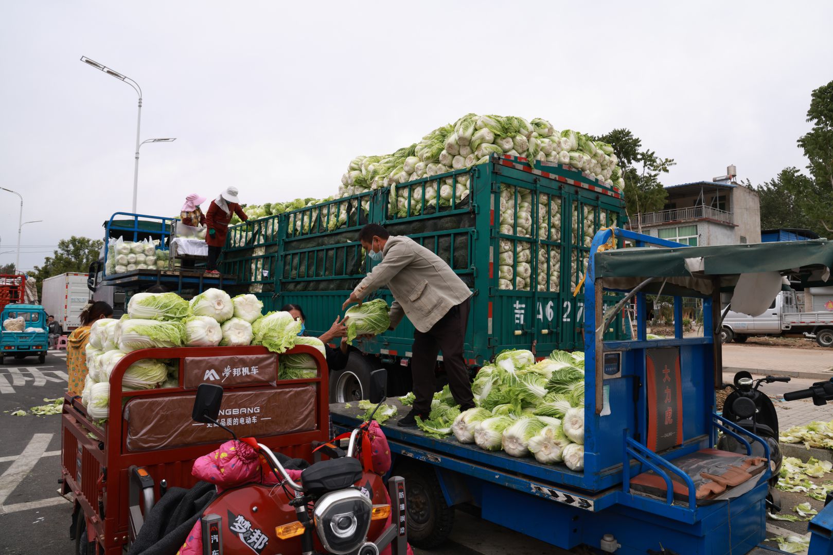 24日早上,在阜陽瑤海農產品備用批發市場,我們看到的是一片繁榮熱鬧的景象,原本寬闊的馬路兩邊停滿了貨車,車上整整齊齊地擺滿了大白菜、花菜、豆角等各類蔬菜。批發商們騎著貨運三輪車,穿梭在大貨車之間,不一會兒就買到自己滿意的蔬菜。