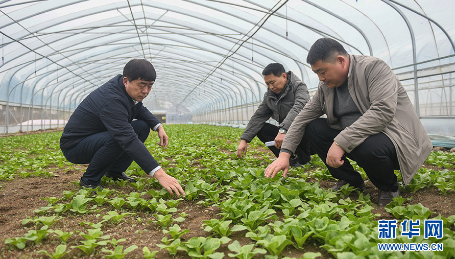 在阜陽市潁州區(qū)九龍鎮(zhèn),閆永志(左一)正在查看蔬菜長勢(3月18日攝)。