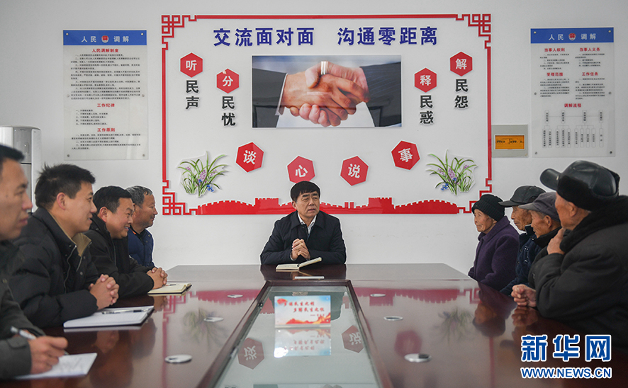 在阜陽市潁州區(qū)九龍鎮(zhèn)矛盾調(diào)解室內(nèi),閆永志(中)正在為群眾調(diào)解矛盾(3月18日攝)。