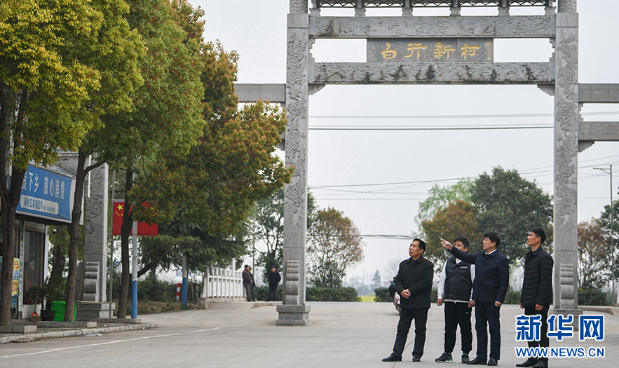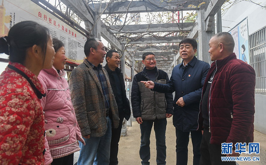 在阜陽市潁州區(qū)西湖鎮(zhèn)白行社區(qū),閆永志(右二)正在和當?shù)厝罕娨黄鹩懻摻陙磬l(xiāng)村的變化(3月18日攝)。