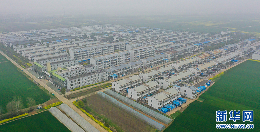 阜陽市潁州區(qū)西湖鎮(zhèn)白行社區(qū),一排排新樓房見證著鄉(xiāng)村的蝶變(3月21日無人機拍攝)。