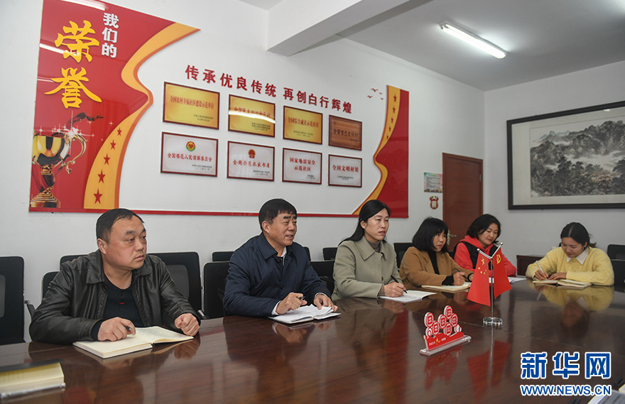 在阜陽市潁州區(qū)西湖鎮(zhèn)白行社區(qū),閆永志(左二)參與文明創(chuàng)建工作調(diào)度會議(3月22日攝)。