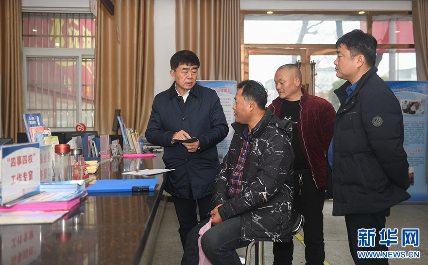 在阜陽市潁州區(qū)西湖鎮(zhèn)白行社區(qū),閆永志(右二)正在和當?shù)厝罕娎页!⑧l(xiāng)情(3月22日攝)。