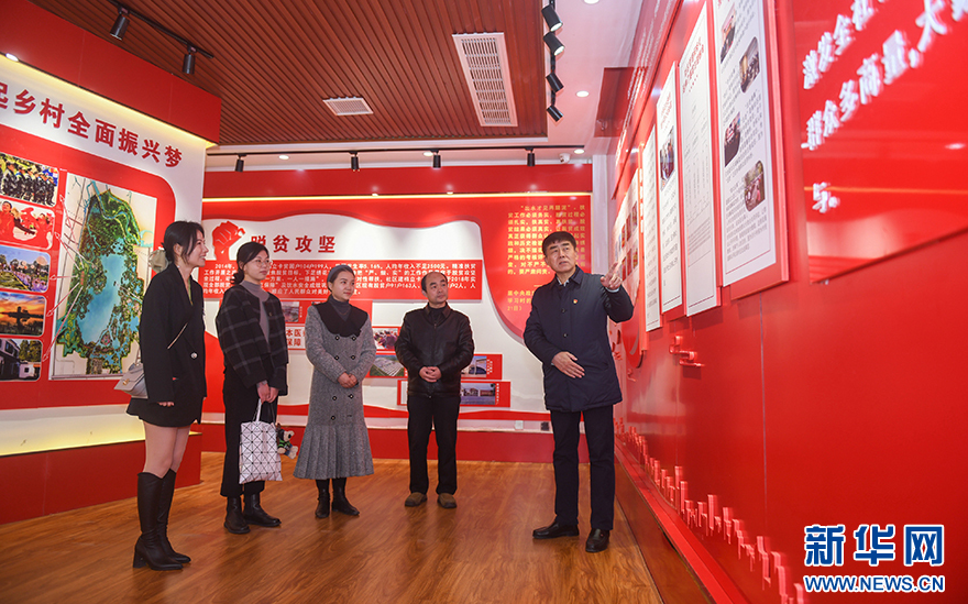 在白行社區(qū)新時代文明實踐站,閆永志(右一)向前來參觀考察的客人介紹白行社區(qū)的變化(3月22日攝)。