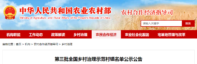貫徹落實黨的二十大精神,按照《中共中央、國務院關于做好2023年全面推進鄉村振興重點工作的意見》部署安排,農業農村部、中央宣傳部、司法部聯合開展第三批鄉村治理示范村鎮創建工作。經地方推薦和專家評審,擬認定北京市大興區龐各莊鎮等100個鄉(鎮)為第三批全國鄉村治理示范鄉鎮、北京市朝陽區高碑店鄉高井村等1003個村為第三批全國鄉村治理示范村。現將名單進行公示,聽取社會意見,接受社會監督。公示期為2023年9月4日至8日。如有意見和建議,請實名向農業農村部農村合作經濟指導司反映。反映情況須客觀真實、實事求是,并將證明材料發送至xczlzdc@agri.gov.cn。 聯系方式:010—59193105。 附件:第三批全國鄉村治理示范村鎮公示名單