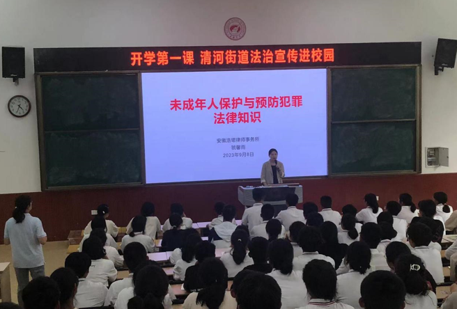 為進一步提升青少年的法治意識,提高識邪防邪反邪拒邪的能力,營造科學文明、平安和諧的校園氛圍,9月8日,清河街道辦事處平安辦聯合安徽浩珺律師事務所、司法所、禁毒辦、城南派出所、西清社區在阜陽市第三中學開展了一場生動的法治講座。