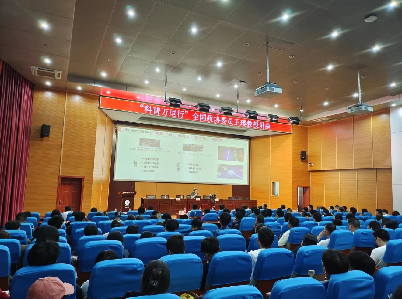 活動現場,王璞教授圍繞先進激光與光纖技術及應用,從激光的前世今生、激光原理簡介、激光器的分類、激光的應用、激光發展與展望五個方面系統地把激光的秘密剖析出來,展現在聽眾的眼前。臺下,大家神情專注,邊聽邊記,激光科學創造微觀世界,開辟人類浩蕩無際、光明燦爛的前景深深感染了現場的聽眾,激勵著青年學子們勇于探索未知,不斷拼搏進取,為中華民族偉大復興奉獻才華和力量。