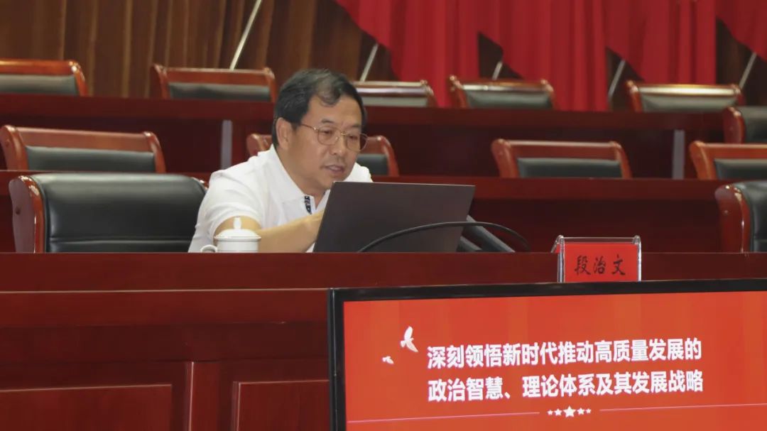 段治文教授圍繞“深刻領悟新時代推動高質量發展的政治智慧、理論體系和發展戰略”,從深刻領悟新時代推動高質量發展的政治信念和政治智慧;深入領會新時代中國式現代化的重大理論創新;整體把握新時代推動高質量發展的中國式現代化發展戰略;自覺增強新時代中國共產黨人的黨性修養等4個方面進行了系統講解和具體分析,幫助大家深化了對新時代推動高質量發展的政治智慧、理論體系及其發展戰略的理解和把握。