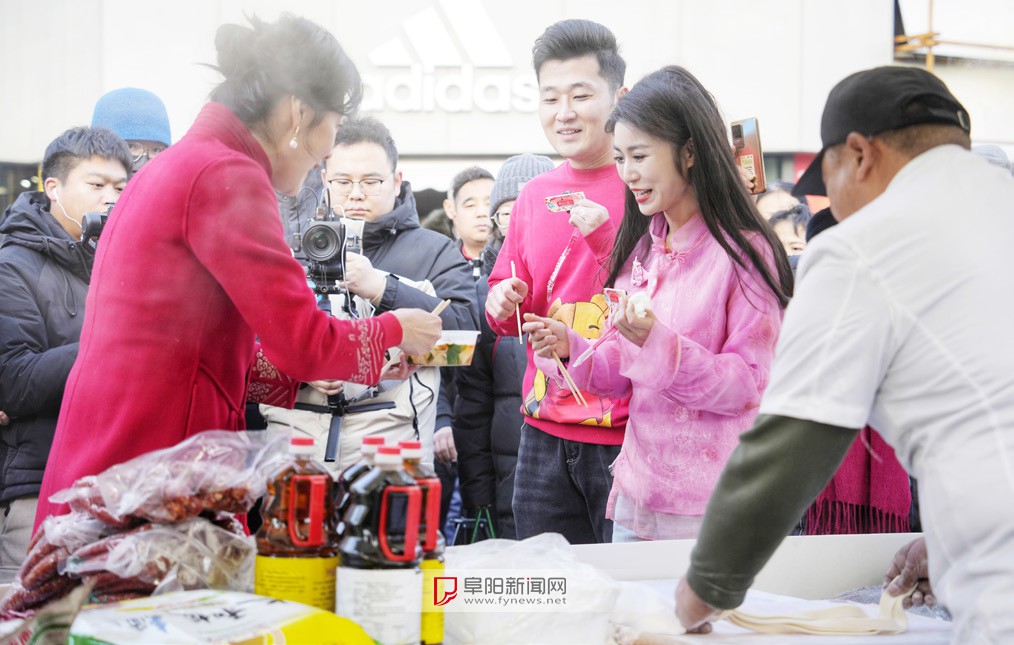“來我直播間,1號鏈接豬皮凍9.9元一袋,這可是線上才有的價格,下手晚就沒有了。”在集市中,一個穿著大花棉襖的身影吸引了不少市民的注意。定睛一看,原來是“濤哥吃阜陽”賬號的主播,正對著手機侃侃而談,賣力地為各個攤位帶貨。