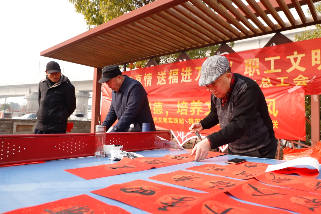 在文藝表演前,來自阜陽市婦女兒童醫(yī)院的醫(yī)務工作者們穿插與居民中,向他們宣傳兩癌篩查的重要性,并提醒他們要定期進行檢查和治療;區(qū)總工會和區(qū)婦聯(lián)的志愿者們免費為村民理發(fā)、按摩,并向居民發(fā)放《反家庭暴力法》等宣傳手冊;書法愛好者們現(xiàn)場鋪開紅紙、揮毫潑墨,一副副散發(fā)著墨香的春聯(lián)隨筆而生,字里行間是滿滿的祝福;一旁的蒸籠里,桃花村現(xiàn)場蒸的大白饃正散發(fā)著騰騰熱氣,寓意著日子蒸蒸日上。