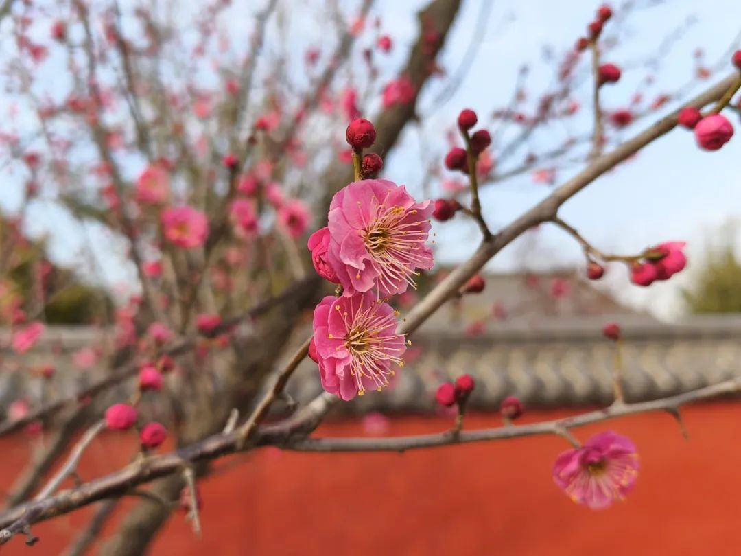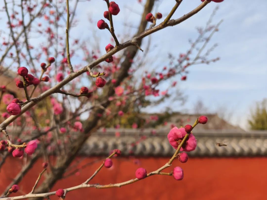 漫步蘭園怡園,放眼望去,一株株紅梅上,一個個花骨朵含苞待放,偶有冒頭的幾抹嫣紅熱烈地點綴在枝頭,在陽光的映襯下格外顯眼。