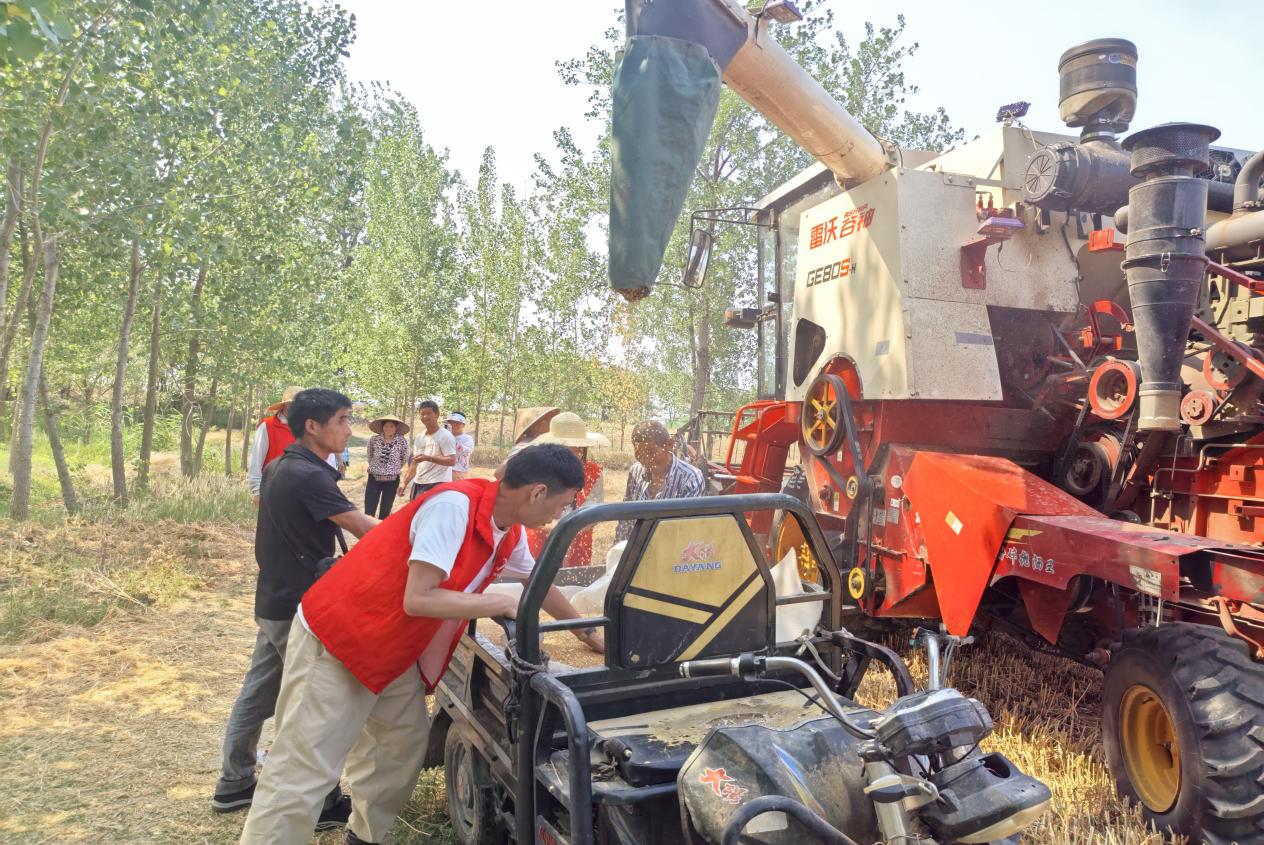 接麥子、裝車、清理麥秸、晾曬小麥、為農(nóng)機手送清涼……,志愿者們分工明確、配合默契,大家鉚足勁地干,農(nóng)田里呈現(xiàn)一派熱火朝天的農(nóng)忙景象,盡管烈日炎炎,氣溫居高不下,但志愿者們熱情高漲,一上午時間,就幫助3戶村民收割小麥十余畝。農(nóng)戶們目睹志愿者們忙碌的身影,紛紛豎起大拇指。“多虧了這些年輕人,不然我這幾畝地真不知道什么時候能收完。”村民李克玉望著裝車的小麥感慨道。